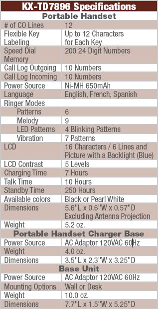 Operation Provides clear sound, enhanced range and reduced interference from radios, computer monitors and fluorescent lighting, compared to ordinary wireless phones. Frequency Hopping Spread Spectrum (FHSS) Technology The Panasonic KX-TD7896 cordless phone utilizes Frequency Hopping Spread Spectrum (FHSS) technology in the 2.4GHz band. FHSS technology brings an important benefit to the user: security. Cordless phones with FHSS are more secure than regular cordless phones because they transmit over the entire bandwidth, constantly changing frequency. This constant change, or Frequency Hopping, deters electronic eavesdropping. Caller ID Compatible The KX-TD7896 can display an incoming caller’s phone number or name for effective call screening. Hands-Free Speakerphone with Auto Answer The convenient built-in speakerphone, combined with the Auto Answer feature, gives you the freedom to answer and talk hands-free from anywhere within the converge area.  |